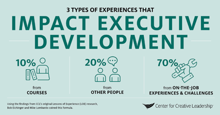 The Center for Creative Leadership has long described how leaders actually develop: 70% comes from on-the-job experience and challenges, 20% comes from relationships with other people, and 10% comes from formal courses and training.